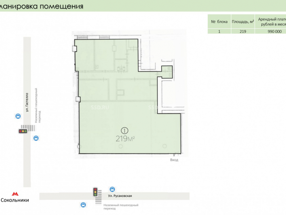 г. Москва, ВАО, район Сокольники, ул. Русаковская, 22 (на перекрёстке с улицей Гастелло). Ближайшая станция метро Сокольники в 2 минутах пешком. Первая линия домов, высокий пешеходный трафик и рекламный потенциал, отличная визуализация объекта. Размещение вывески на фасаде. Рядом остановки общественного транспорта, пешеходный переход. Торговое окружение: Росбанк, Салон красоты Тони Глэм, отель Holliday inn Sokolniki, Азбука Вкуса, М.Видео, Бетховен, Сеть аптек 36.6 и многие другие.