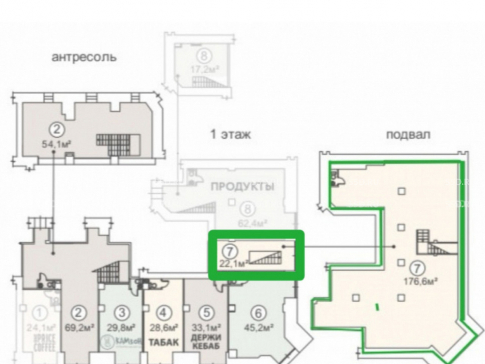 Общая площадь 198.7 кв метров. Первый этаж 22 кв метра, подвал 176,6 кв.м. Высота потолков в подвале 2,9 метра, высота потолков на первом этаже 6,1 метра. Городские коммуникации. Электроэнергия 15 кВт. Место для размещения вывески на фасаде.