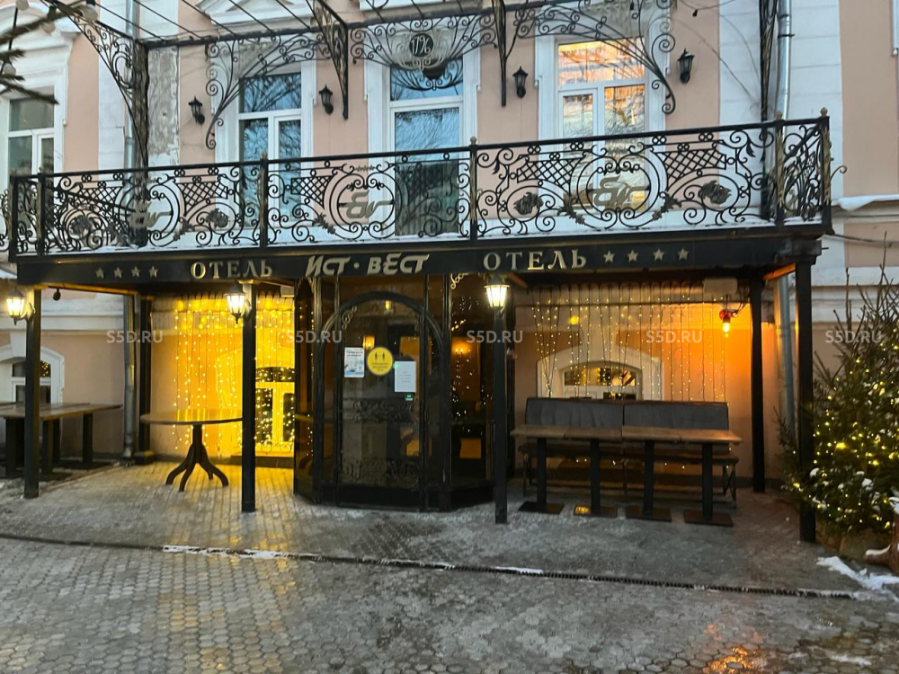 Технические характеристики: первая линия, отдельно стоящее здание, 3 этажа + подвал (1ый этаж 492 м2, 2ой - 345 м2, 3ий - 345 м2, подвал - 545 м2. Общая площадь объекта 1 727 м2, площадь земельного участка 950 м2 + 104 м2, в аренде у города. Высота потолков от 3,6 до 3 м, электрическая мощность 200 кВт. Все коммуникации в наличии, несколько мокрых точек, ремонт за выездом арендатора (отель 4*), внутренний двор с рестораном.
