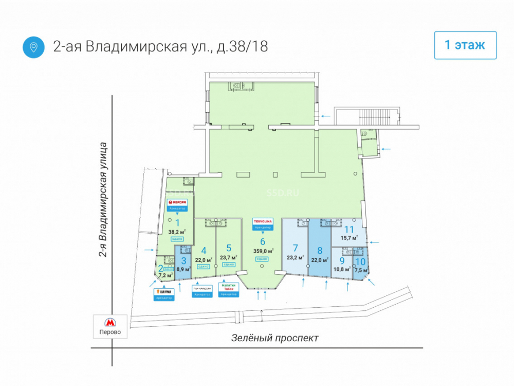 Предлагается в продажу помещение формата Street retail с сетевым арендатором в ВАО, в блочном 9и этажном жилом доме 1965 года постройки, расположенному по адресу: г. Москва, 2-я Владимирская ул. д.38/18.