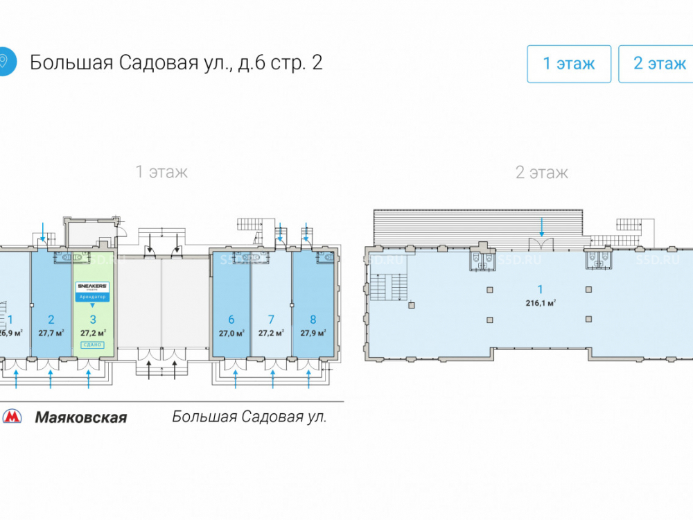 Предлагается в аренду помещение торгового или свободного назначения (ПСН) площадью 243 кв.м 2ой этаж нежилого здания, расположенного по адресу: г. Москва, Большая Садовая ул., д. 6, стр. 2, ЦАО, район Пресненский. Шаговая доступность от ст. метро "Маяковская" - 3 минуты пешком. Вход с Садового кольца. Высокий рекламный потенциал и место для размещения вывески. Отличная пешеходная и транспортная доступность. Сверхинтенсивный пешеходный и автомобильный трафик. Отлично подойдёт под любой вид деятельности - торговое помещение, магазин, ресторан, кафе, аптека, салон красоты, банк, офис продаж, кофейня и др.