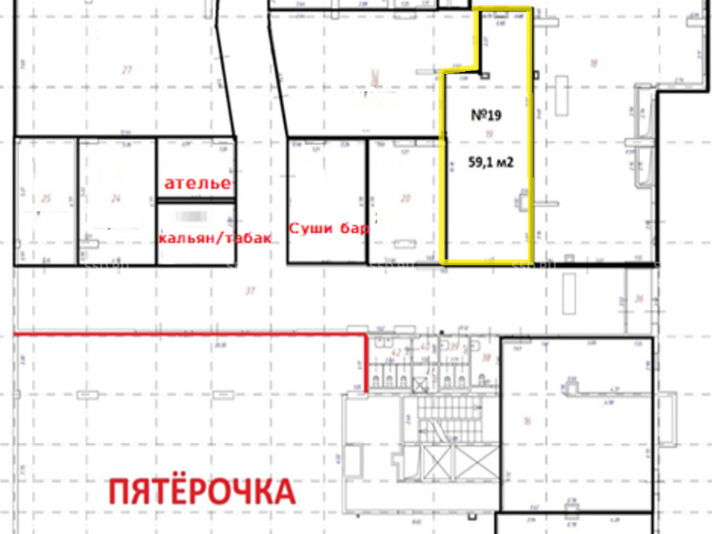 1-ый этаж жилого 10-этажного дома. Общая площадь 59,1 м², Прикассовая зона супермаркета "Пятёрочка". Отдельный вход, витринное остекление, открытая планировка. Мощность электроэнергии 28 кВт. Высота потолков - 4 м.