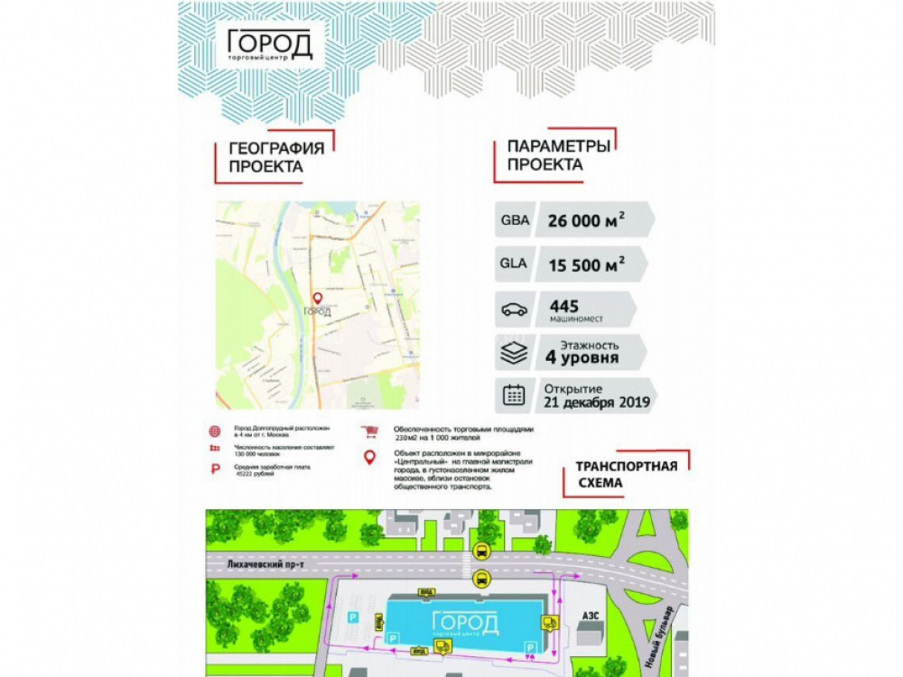 Предлагается к продаже 3-х этажный современный, крупный ТЦ "Город" с топовыми арендаторами, по адресу: МО, Долгопрудный, ул. Лихачевский проспект, 74, площадью 26 000 м2. Первая линия. Развитая инфраструктура. Интенсивный пешеходный и автомобильный трафик вдоль здания.