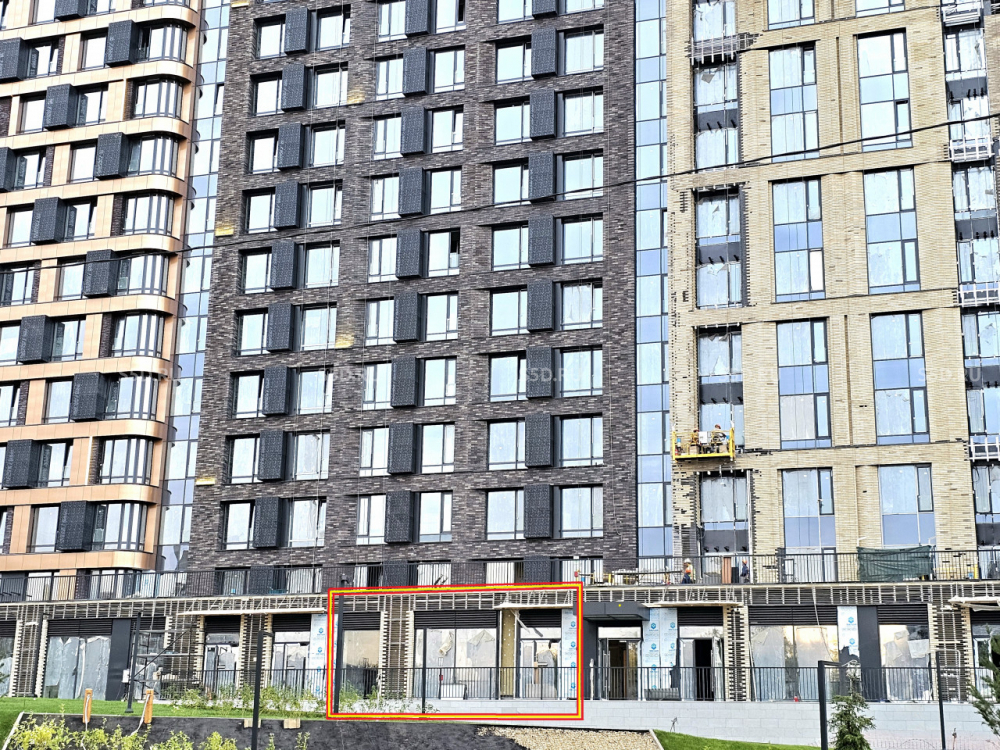 Площадь - 101.6 кв.м, 1-й этаж 17-этажного жилого дома, витринное остекление в пол, высота потолков - 4,18 м, электрическая мощность - 0.25 кВт на 1 кв.м. Подземный паркинг. Городской паркинг по фасаду. Нагрузка на пол - 400 кг/м2. Состояние помещения - в бетоне.