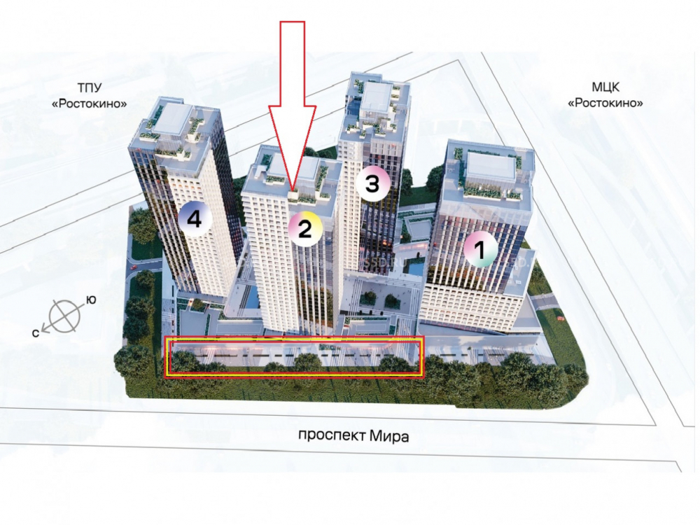 Продажа торгового помещения в новом многофункциональном ЖК бизнес-класса по адресу: Москва, Проспект Мира д. 222. СВАО, район Ярославский. Ближайшая станция метро (МЦК) Ростокино 3 мин. пешком. ЖК Мираполис состоит из 4 жилых башен 33-35 этажей с подземным паркингом. И расположен рядом с ТПУ Ростокино, где сосредоточены потоки транспорта и пешеходов, пересадка с МЦД на МЦК. Ежедневный пассажиропоток через станцию МЦК Ростокино 64 тыс. человек (по данным Метростат).