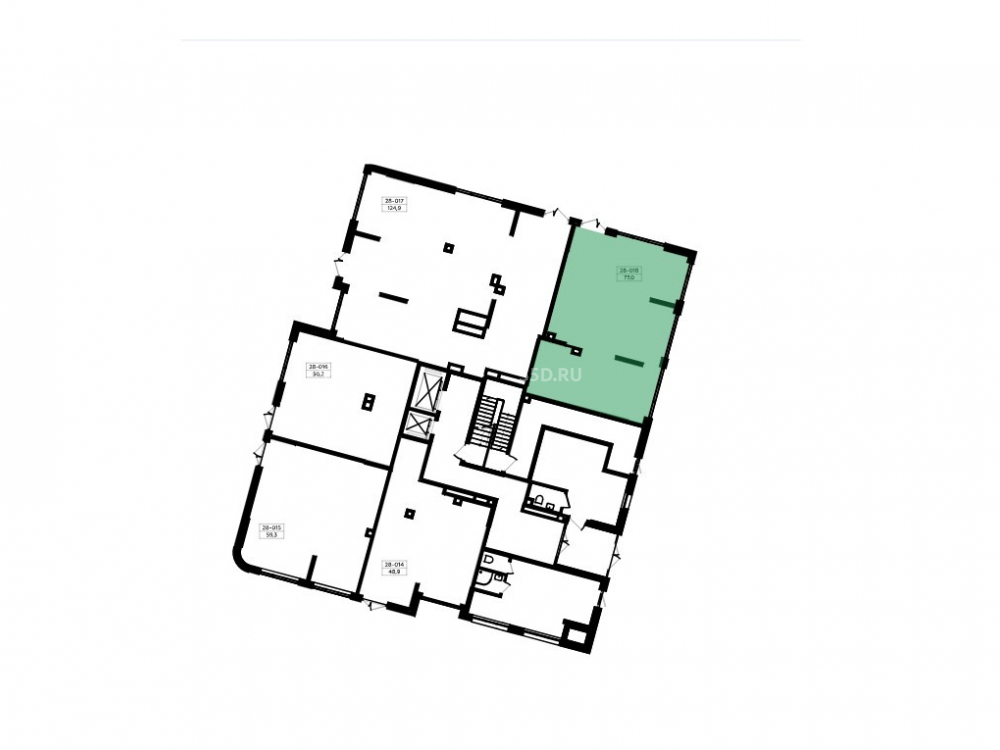1 этаж 16-ти этажного жилого дома, общей площадью 77 м², высота потолков 6,21 м, электрическая мощность 15,4 кВт, отдельный вход, витринное остекление, зальная планировка, нагрузка на пол 600 кг/м². Приточной вентиляции нет.