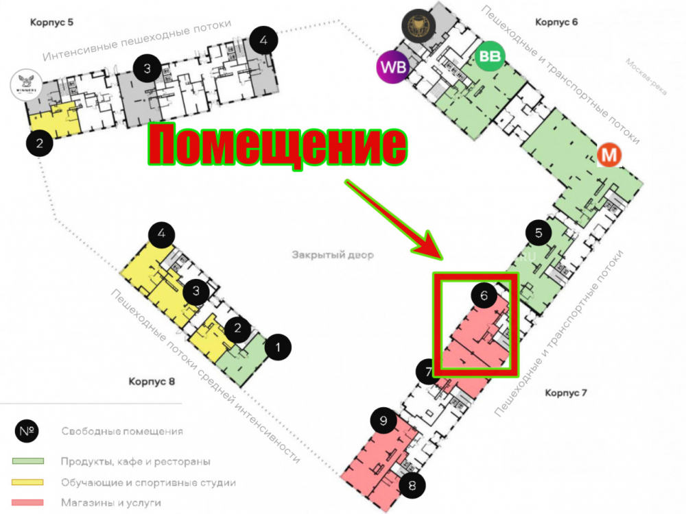 1 этаж 26-ти этажного жилого дома, площадью 174,5 м², высота потолков 5 м, приточно-вытяжная вентиляция, отдельная входная группа с улицы и 2 входа со двора, витринное остекление, место для размещения вывески, отделка - Shell & Core.