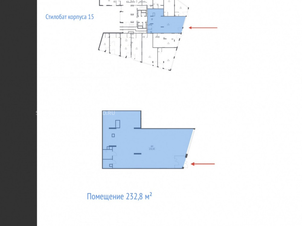 1 этаж 33-х этажного жилого дома (стилобат), общей площадью 232,8 м², высота потолков 4 м, электрическая мощность 17 кВт, мокрая точка (ГВС, ХВС. канализация), отдельная входная группа, витринное остекление, зальная планировка, первая линия.