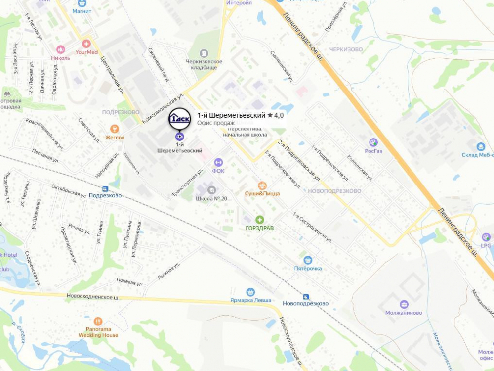Ближайшая станция метро: «Планерная» - 25 мин. на транспорте, ж/д станция «Подрезково» - 6 мин. пешком.