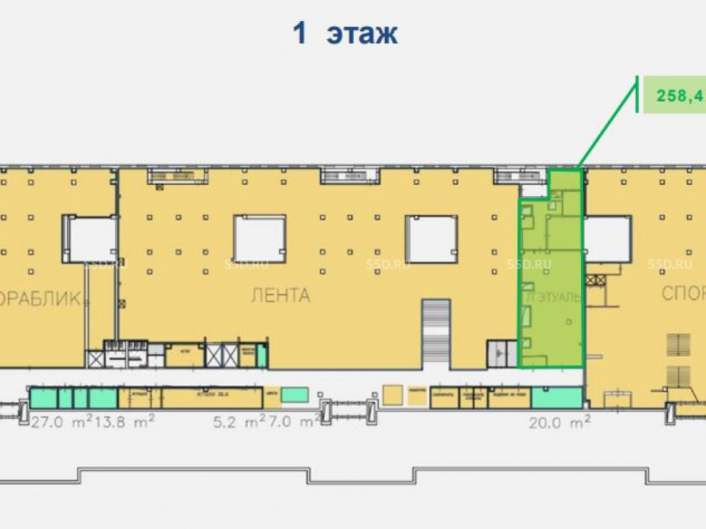 Площадь помещения - 258,4м2. 1 этаж. Электрическая мощность - 63кВт. Отдельный вход. Нет перепадов высот. Есть зона разгрузки. Потoлки: 1-й этaж - 2,6м. Витринное остекление. отдельный вход