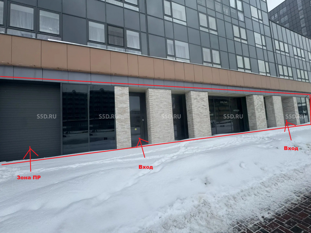 Помещение 243 кв м, на 1-м этаже 14-этажного жилого дома. Вход с первой линии. Зальная планировка, витринные окна, высота потолков: 4,7 м. Выделенная мощность: 80 кВт. Бетон. Есть отдельный вент.канал на крышу.