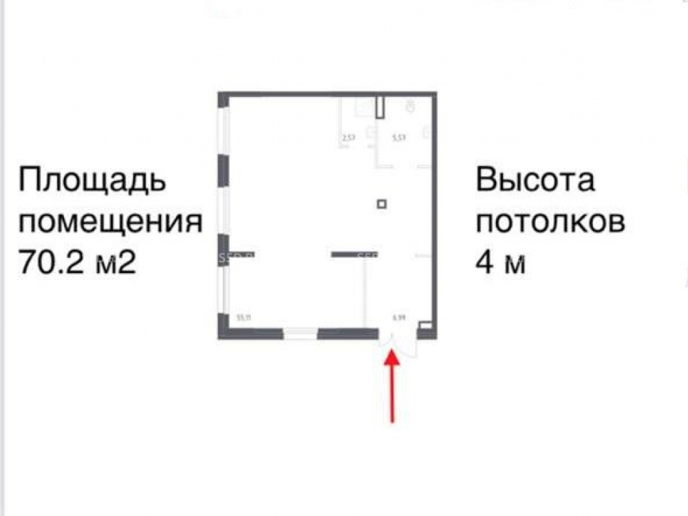 Корпус 4. Угловое помещение. Общая площадь – 70.2 кв. м., 1 этаж. Отдельный вход. Большие витринные окна. Высокие потолки – 4,02 м. Электрическая мощность – 14 кВт. (0,2 кВт на кв. м), возможно увеличение. Свободная планировка. Состояние помещения – под отделку. Подвод ГВС, ХВС, канализация, отопление. Парковка на улице. Паркинга под помещением нет - возможно под медицину.