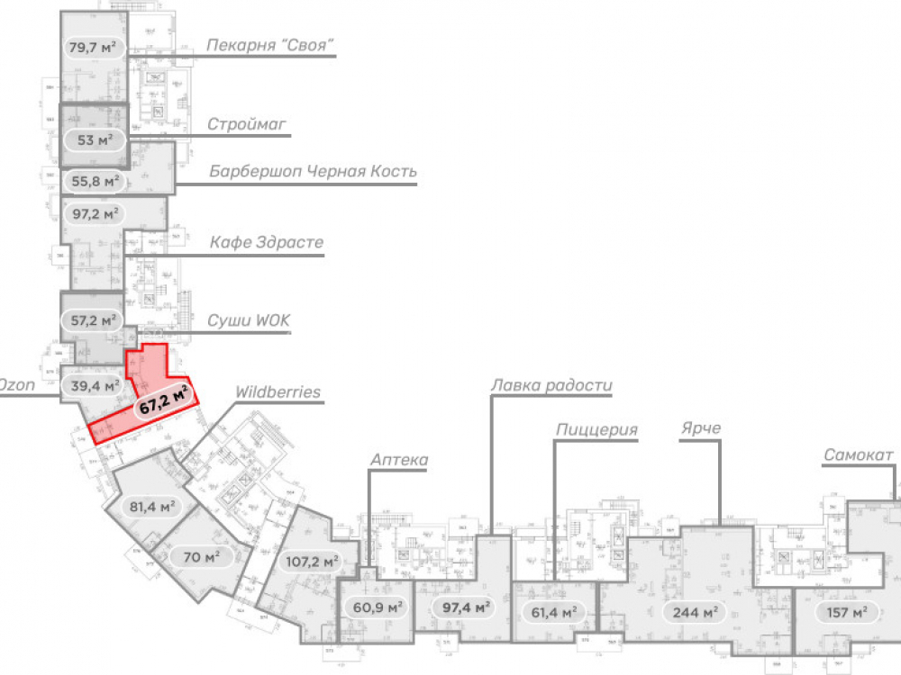Торговое окружение: супермаркет Магнит, ВинЛаб, Бристоль, ВкусВилл, аптека Здравсити, пекарня Буханка, пункт выдачи Wildberries и Ozon, салон красоты Arev Cool
