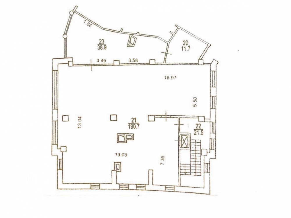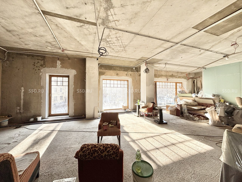 Помещение имеет три уровня, общая площадь - 433 кв.м. (1 этаж - 262,8 кв.м., цоколь с окнами - 129,4 кв.м., подвал - 40.8 кв.м.)