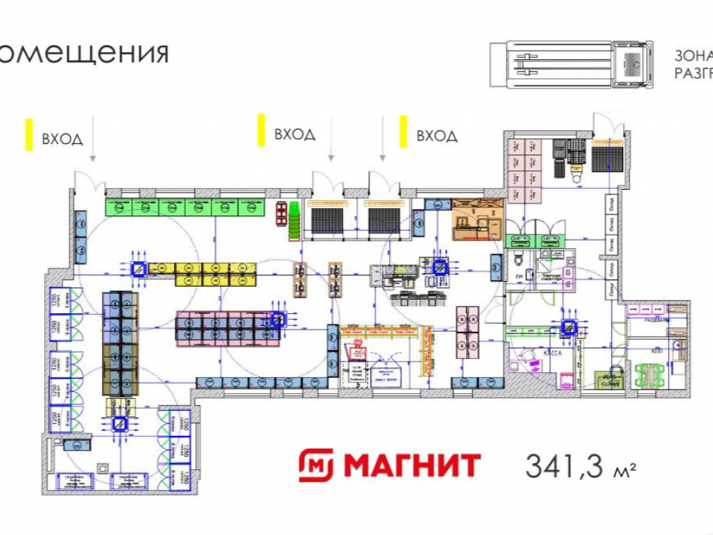 помещение площадью 341,3 м2 на 1 этаже в стилобатной части жилого дома. Высота потолков 4 метра. Первая линия домов, 3 отдельных входа. Витринное остекление по фасаду, электрическая мощность 68,3 кВт, отдельная зона разгрузки