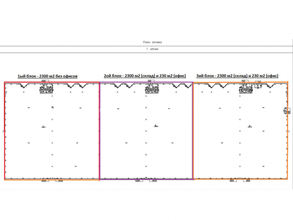 • Возможно деление либо на три блока примерно по 2600 м2 (2300 (склад) + 230 м2 (офис), либо на два блока - один примерно 5200 м2 (4600 склад, 230 (офис)), второй - 2600 м2 (2300 (склад) + 230 м2 (офис)