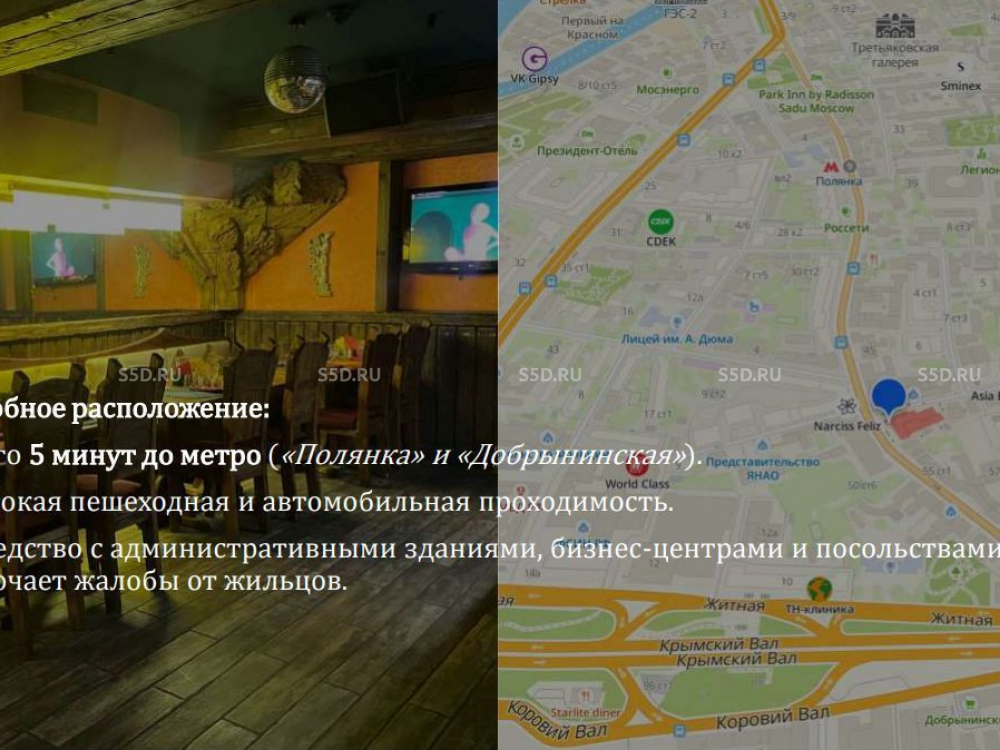 Ближайшая станция метро - м. Добрынинская, 5 минут пешком. Помещение находится в центре города в сформировавшемся торговом коридоре. Рядом находятся сетевые магазины, аптеки, кафе и рестораны, к примеру, такие как: "Мята платинум" и "Чайхона №1".