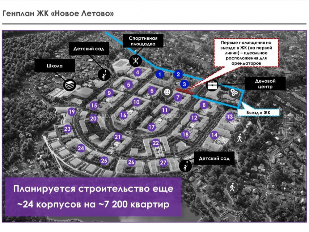 Предлагается в продажу торговое помещение с супермаркетом «Магнит» в ЖК бизнес-класса «Новое Летово» по адресу: г. Москва, НАО, поселение Сосенское, ЖК «Новое Летово». Ближайшие станции метро: Филатов Луг – 10 мин. транспортом, Саларьево – 13 мин. транспортом, Прокшино – 10 мин. транспортом. Жилой комплекс расположился рядом с усадьбой Валуево – редким примером богатого, прекрасно сохранившегося дворянского гнезда. Развивающийся район. Первая линия домов. ЖК «Новое Летово» — это три многоквартирных дома бизнес-класса с переменной этажностью от 7 до 8 этажей, окружен рощами Валиевского лесопарка, в 8 км от МКАД на улице Зимёнковская, соединяющей Калужское и Киевское шоссе. С учетом строительства новых очередей ЖК «Новое Летово» в ближайшей зоне будет расположено около 8000 квартир, а также примерно 800 частных домов. Ввод объектов в эксплуатацию запланирован на 4 квартал 2024 года — 2 квартал 2025 года. В шаговой доступности находится знаменитая школа «Летово» (частная школа-пансион для одаренных детей).