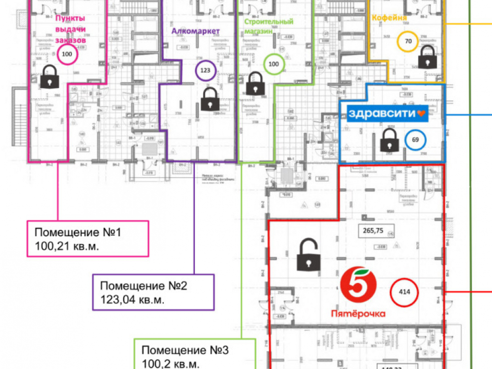 Помещение общей площадью 413,97 кв.м. состоит из двух отдельных помещений под объединение ( 265,75 кв.м. и 148,22 кв.м.). Стилобатная часть 10-ти этажного жилого дома. Открытая планировка. Три отдельных входа ( два с фасада и один со двора). Высота потолка 4 метра, витринные окна по фасаду. Электрическая мощность по запросу. Напротив входа большая наземная парковка для жильцов 2 и 3 корпусов. Все городские коммуникации.