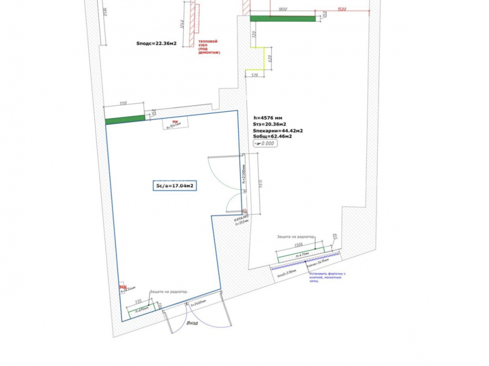 Общая площадь на 1 этаже - 62.4 кв.м. Отдельный вход с фасада. Все коммуникации центральные. Выделенная мощность электроэнергии 25 кВт, можно увеличить. Высота потолков - 4.5 м. Наличие мокрой точки. Витринные окна.