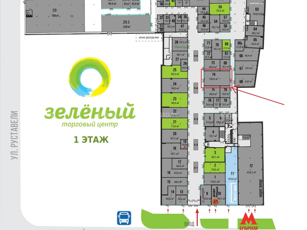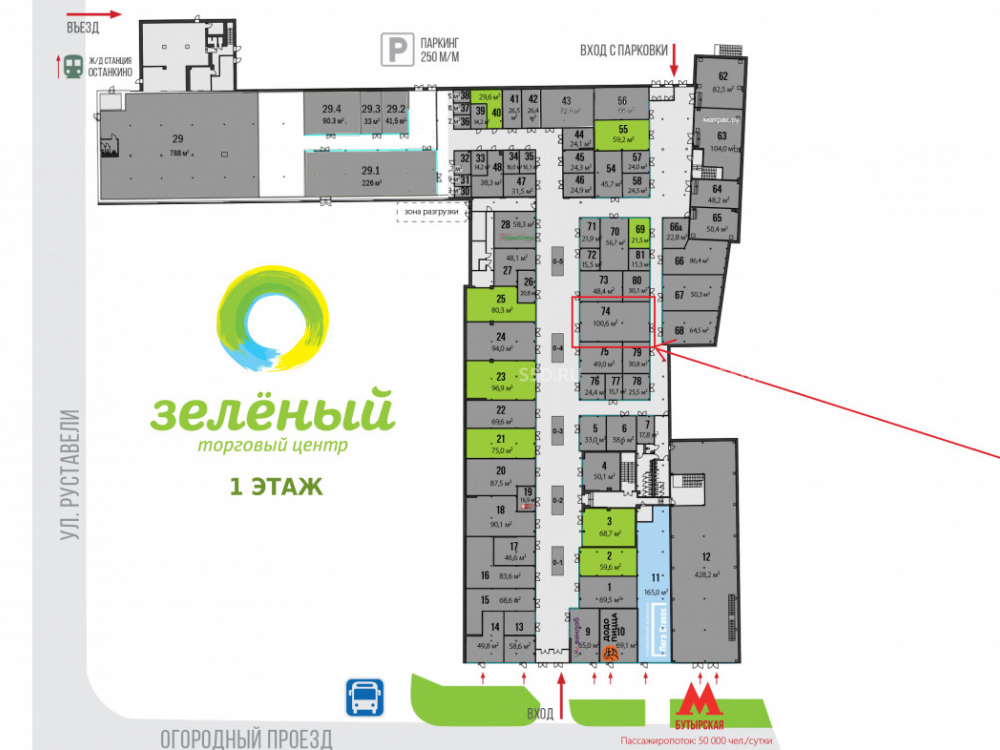 У выхода из метро "Бутырская", расположился ТЦ "Зелёный", это новый, современный торговый центр районного значения в шаговой доступности от ж/д станции "Останкино". Первая линия домов Огородного проезда, на пересечении с улицей Руставели. Прекрасная визуализация в любую погоду и мега интенсивный трафик, дополнительно обеспечен, расположенным офисом: "Яндекс-Еда", "Яндекс-Такси".Помещение расположено в окружении густонаселенного жилого массива с высокой покупательской способностью. На выходе из метро Бутырская новый районный ТЦ Зеленый.