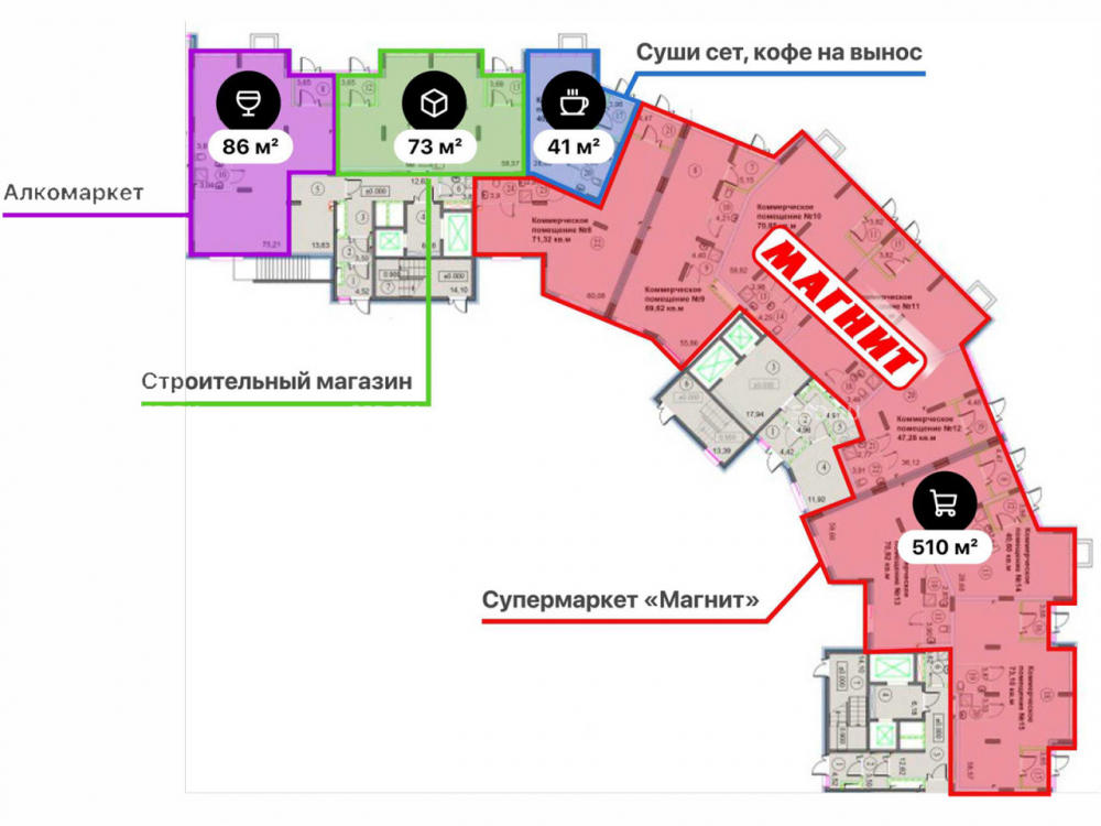 Арендатор "Магнит", МАП 1 275 000 руб., ДДА на 10 лет, индексация 5%; остальные арендаторы в процессе подписания.