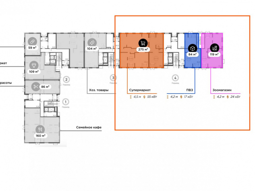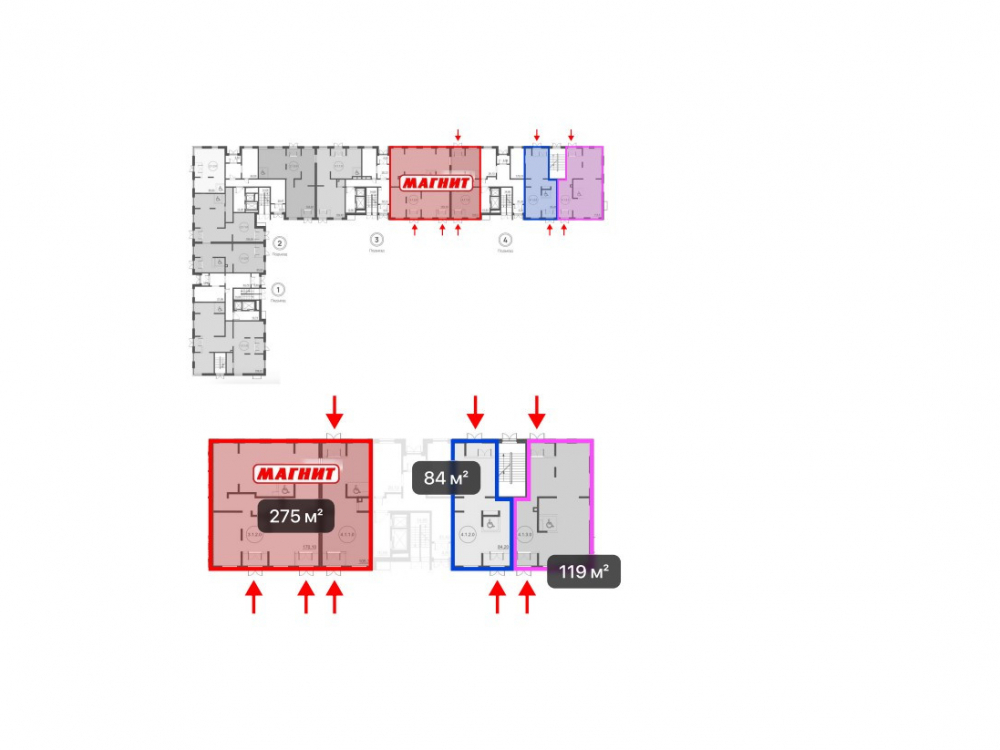Общая площадь - 478 кв.м. 3 помещения: 275 м2 (супермаркет), 84 м2 (ПВЗ), 119 м2 (Зоомагазин). Первый этаж 7 - этажного здания.