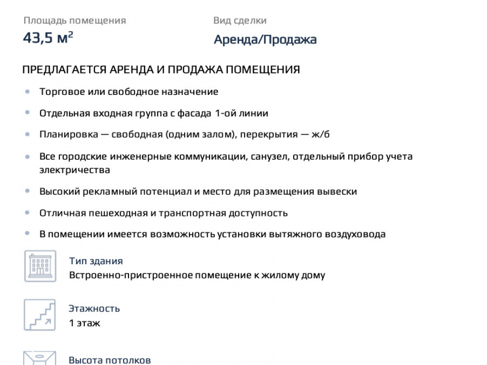 Вашему вниманию предлагается в аренду помещение 43.5 квадратных метров в пристроенном здании, расположенное по адресу: ЮВАО, Бpaтиславская ул., д.15 корп.1. Отдельная входная группа в 1-ой линии. Отличная пешеходная и транспортная доступность. Развитая инфраструктура. Отлично подойдёт под любой вид деятельности - торговое помещение, магазин, аптека, салон красоты, банк, офис продаж, кофейня.