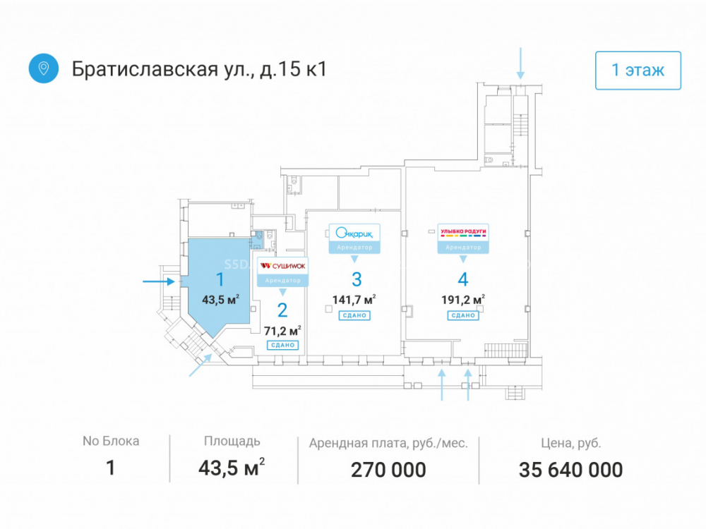 Стоимость аренды в месяц: 270 000 рублей, с учётом эксплуатации и НДС.