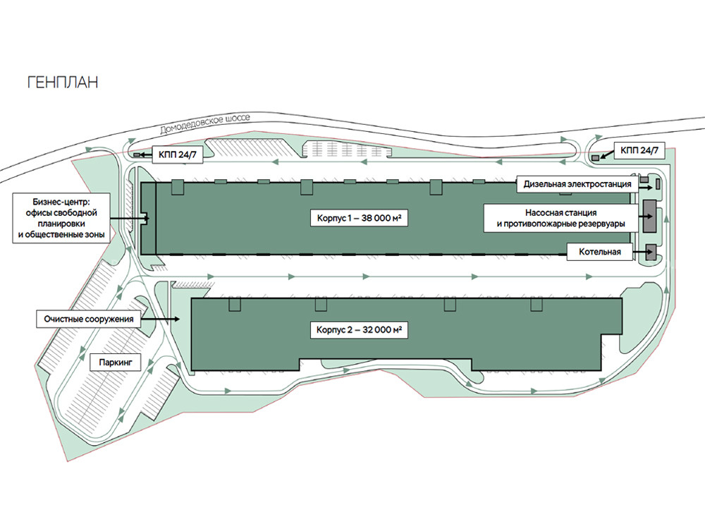 Предлагается в аренду площади от 7500 м² в складском комплексе класса A общей площадью 75 000 м². Индустриальный парк расположен в городе Домодедово в Московской области. Удобная транспортная доступность: рядом пролегают Домодедовское шоссе, так же в непосредственной близости Симферопольское шоссе (М2) 19 км от МКАД, Новокаширское шоссе (М4) 24 км от МКАД.