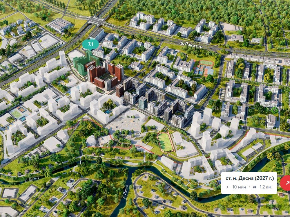 Ближайшие станции метро: Филатов Луг – 26 мин. транспортом. В 10 мин. пешком от части домов ожидается открытие станции метро «Десна» (2027 г.).