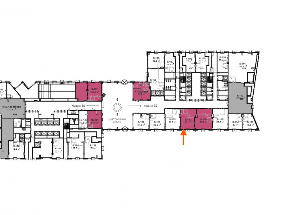 Помещение в стилобате, площадью 82,6 м². Вход с улицы.