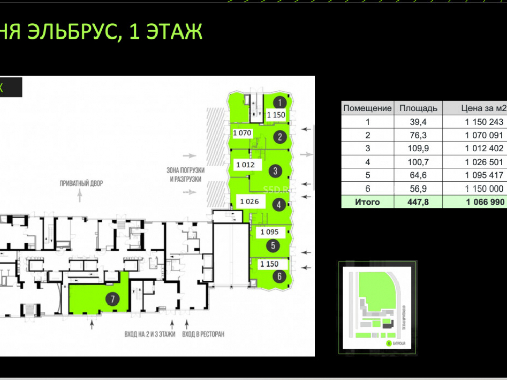 Отдельный вход с фасада. Выделенная мощность электроэнергии 0.2 кВт на м2. Высота потолков - 4 м.