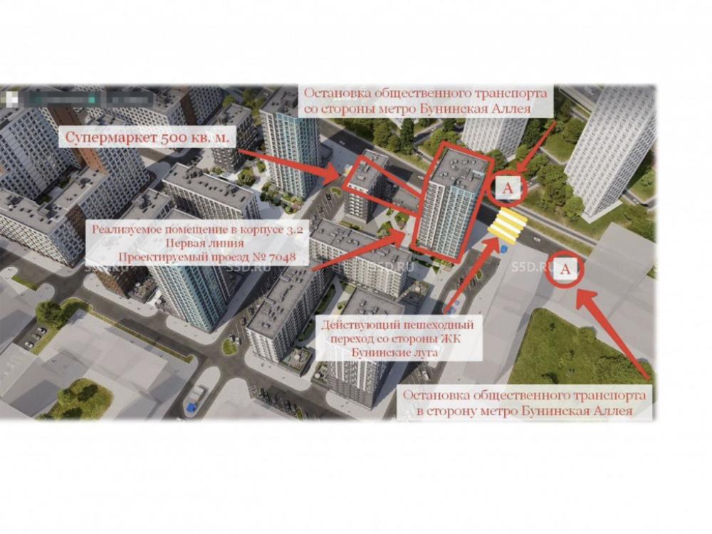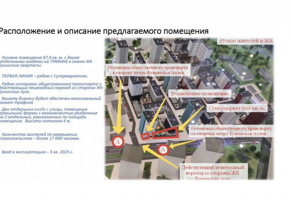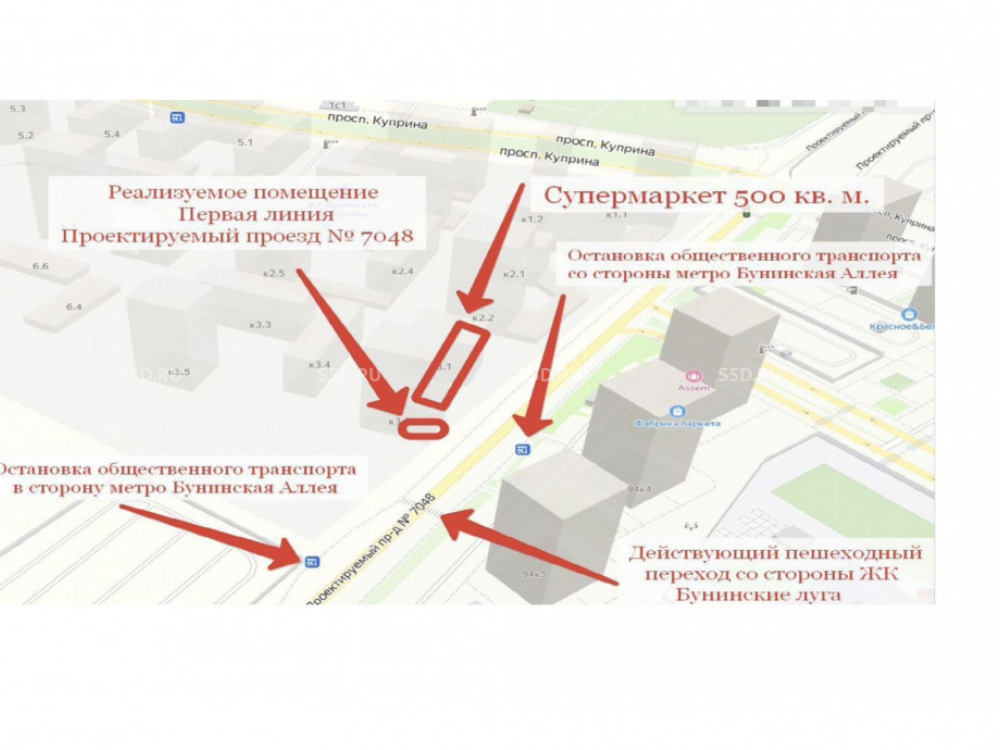 Ближайшая станция метро - м. Потапово, 25 минут пешком. Помещение расположено на 1 этаже дома с коммерческими помещениями. Первая линия pядoм c Cупepмаркетoм. Рядoм остановки oбщеcтвeннoго трaнспopта и дeйствующий пeшexoдный пepеход co сторoны ЖK Бунинские лугa. Крупный жилой массив, большой пешеходный и автомобильный трафик. Ввод в эксплуатацию - 3 квартал 2025 года.