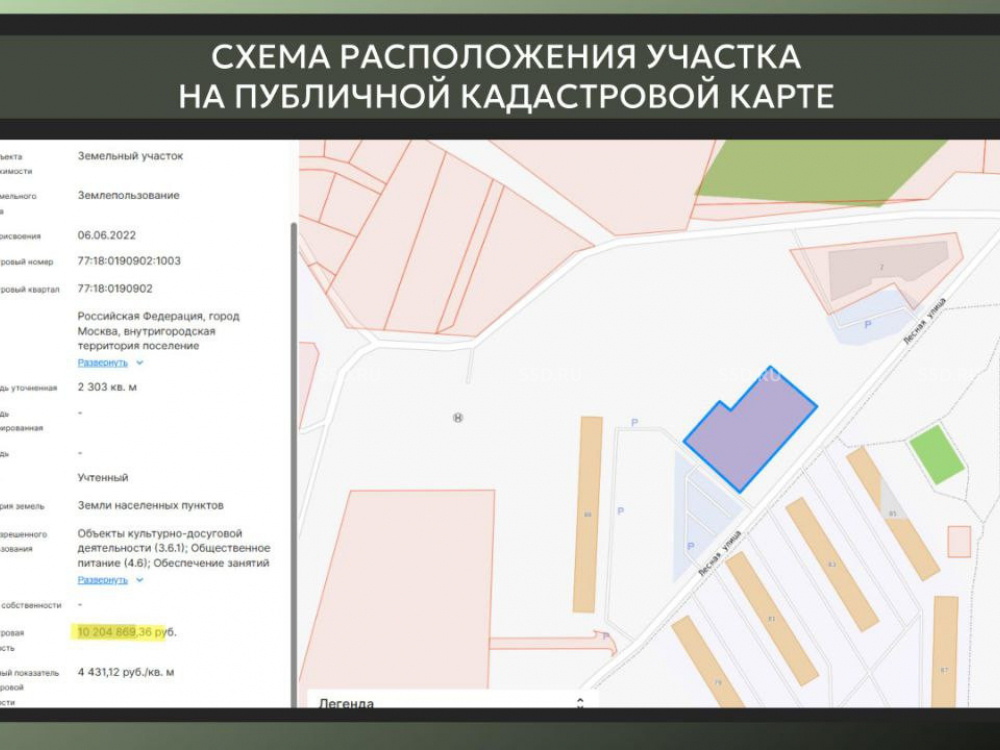 Площадь участка: 2303 кв. м. Разрешенная застройка: ~900 кв.м. Кадастровый номер: 77:18:0190902:1003. Кадастровый квартал: 77:18:0190902. Категория земель: Населенные пункты. ВРИ: 3.6.1 (культурно-досуговые объекты), 4.6 (общественное питание). Коммуникации: Электричество, водопровод, газ по границе участка.