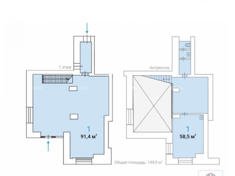 1 этаж - 91.4м2, высота потолка - 4,9м