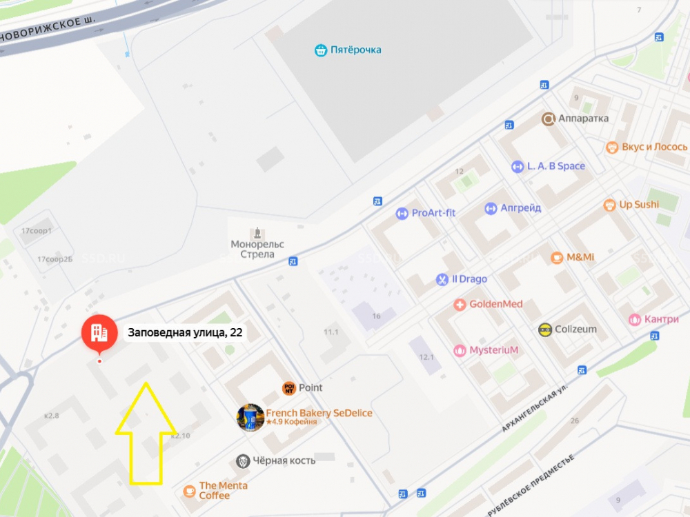 Аренда помещения свободного назначения в ЖК «Ильинские луга» по адресу: Красногорский г.о., п. Ильинское-Усово, ул. Заповедная, 22. Дом расположен на основной улице, ведущей как в сам густонаселенный ЖК, так и к соседним населенным пунктам. Окружение формируют уже заселенные дома, а также дома, которые будут заселены в четвертом квартале 2025 года. Инфраструктура активно развивается. По соседству уже размещены супермаркеты («Пятерочка», «Дикси»), аптека, салон красоты и другие объекты. В трех минутах ходьбы расположена остановка общественного транспорта.