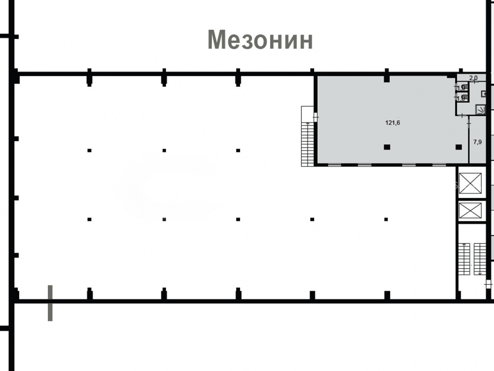 Помещение общей площадью – 941.8 кв. м., Основной зал - 664 м2, Офис 1 этаж- 156.8 м2, Мезонин - 121.6м2, 1 этаж, 1 ворота автоматические, Смешанная планировка. Высота потолков – 6 м. Электрическая мощность – 150 кВт. (1 мегаватт в резерве), парковка на 10м/м