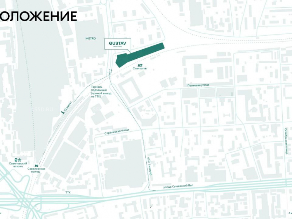 Креативно-деловой кластер «GUSTAV» представляет новый стандарт ведения бизнеса в Москве. Уникальный синтез исторической архитектуры и современных технологий создает здесь неповторимую атмосферу для работы, шопинга и отдыха. Объект расположен в престижном окружении - рядом находятся бизнес-парк «Станколит», комплексы «Шереметьевский», «Pride» и «Савёловский Сити», а также крупнейшие торговые центры Москвы — «Авиапарк» и «Метрополис».