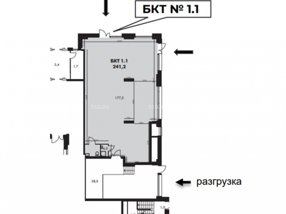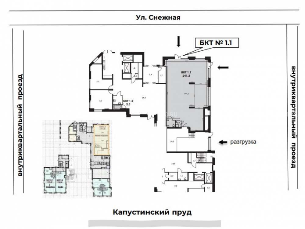 Отдельных 3 входа с улицы, в т.ч. зона разгрузки • вторая линия со стороны ул. Снежная • 1 линия со стороны Капустинского пруда • площадь 241.2 м² • первый этаж • высота потолков 6 м, есть возможность надстроить антресоль • мощность электросети 88,2 кВт (с возможностью увеличения) • центральные коммуникации • витринное остекление • место для разгрузки.