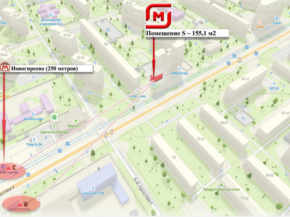 Ближайшая станция метро: Новогиреево – 3 минуты пешком. Центр плотного жилого массива. Первая линия, активный пешеходный и автомобильный трафик. Отличная пешеходная и транспортная доступность. Рядом остановка общественного транспорта.
