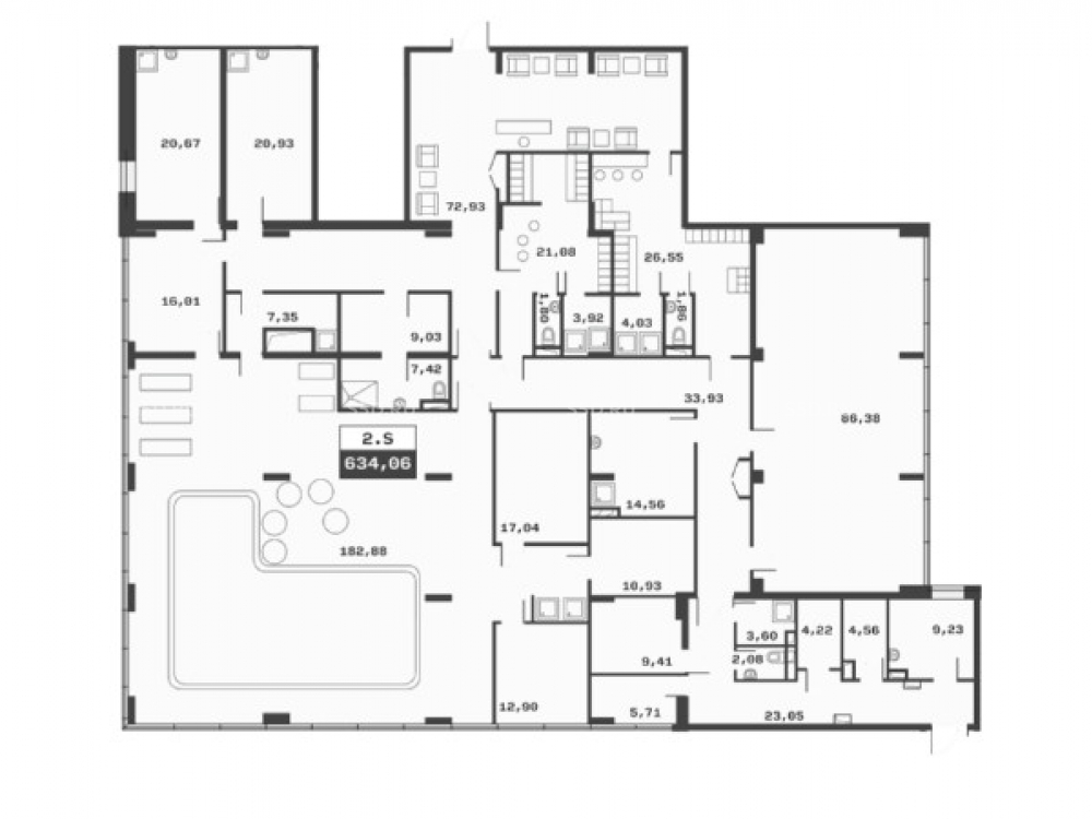Площадь - 634.1 м²., располагается на 2 этаже, отдельный вход , высота потолков - 3.02 м., без отделки.