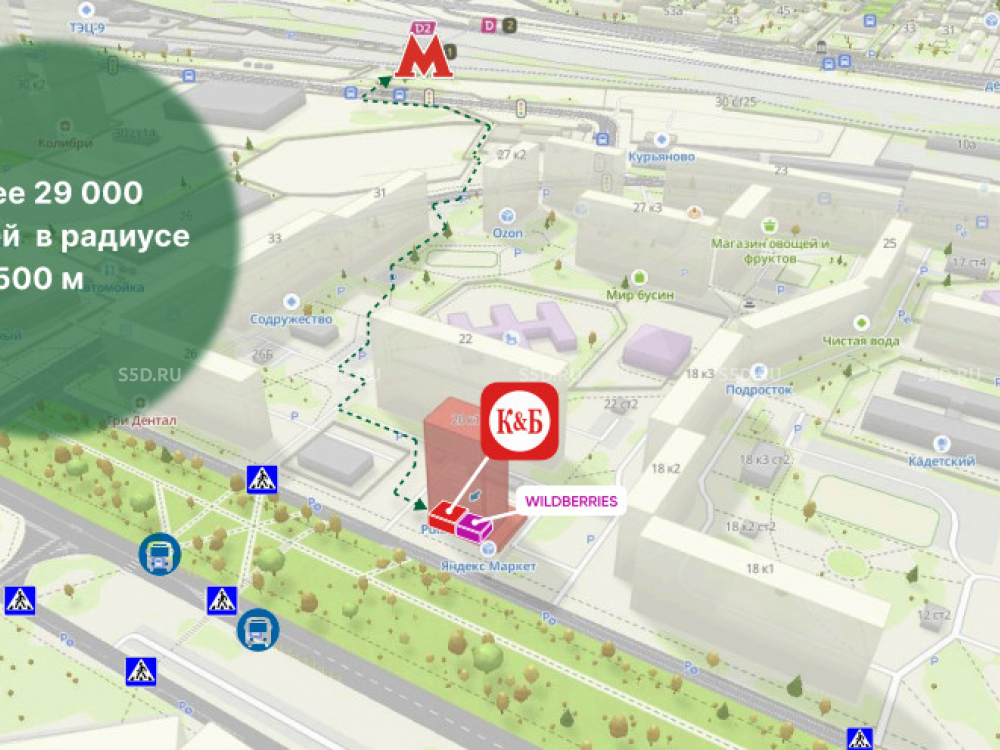 Помещение расположено в первой линии домов в густонаселенном жилом массиве. Более 29 000 жителей в радиусе 500 метров. Хорошая транспортная доступность: рядом МЦД Курьяново и остановки общественного транспорта. Высокий пешеходный и автомобильный трафик. Удобный выезд на основные магистрали: ЮВХ (2,5 км), Каширское (3,5 км) и Бесединское (3,8 км) шоссе. Развитая инфраструктура района: супермаркеты «Пятёрочка», «Дикси», «Верный», детские сады, школы, поликлиника, а также многочисленные бутики и магазины «у дома».