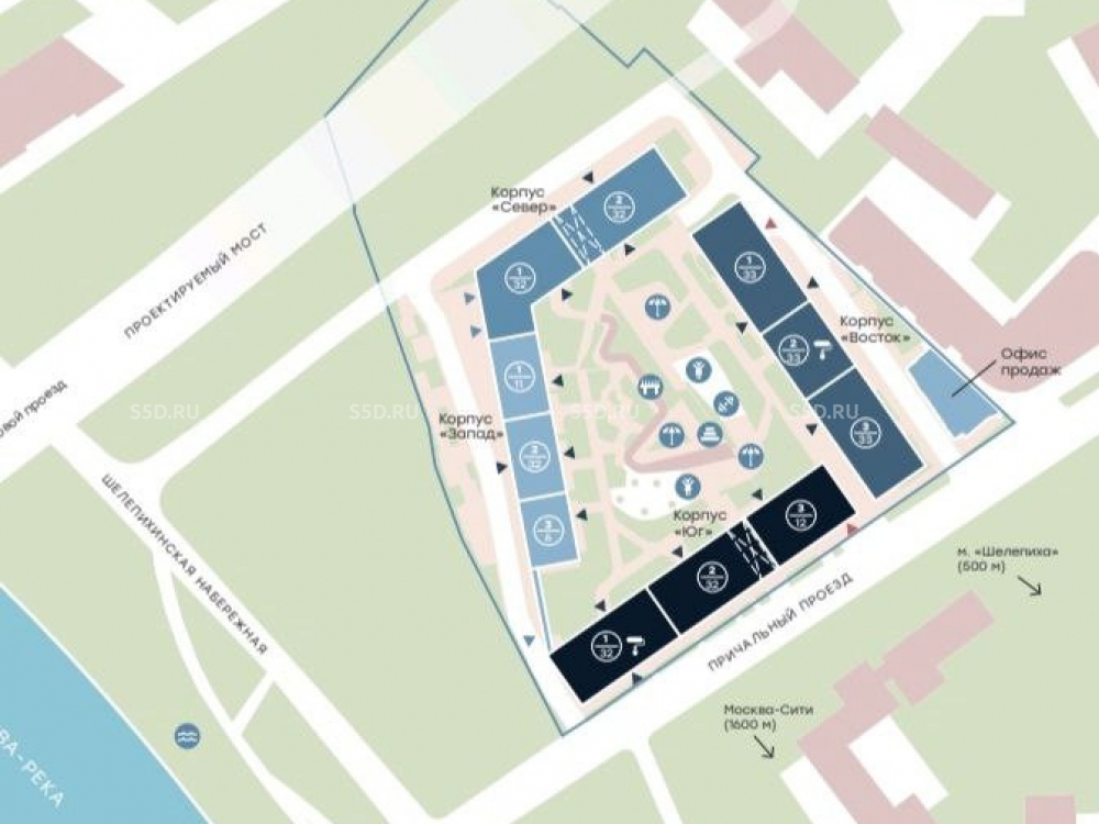 Адрес: г. Москва, СЗАО, район Хорошево-Мневники, Причальный проезд, д. 10, корп. 1 и 2. Объект находится на первой линии с видом на набережную, в непосредственной близости от делового центра города. Отличная транспортная доступность: 7 минут пешком до станции метро и МЦК «Шелепиха». 5 минут на автомобиле до ТТК и 10 минут до «Москва-Сити». ЖК расположен на границе с ЦАО, в месте, где сочетается динамика деловой жизни и умиротворение набережной с зелеными парками. Развитая инфраструктура: В 5 минутах – причал «Сердце Столицы» речного транспорта и пешеходный мост Академика Королева. В скором времени – благоустроенная набережная. Комплекс полностью сдан и заселен. Включает 4 корпуса высотой от 6 до 33 этажей (1950 квартир). На территории функционирует собственный торговый центр площадью 6 000 кв. м с ключевыми арендаторами: супермаркет «Перекресток» и фитнес-клуб DDX, что гарантирует высокий и стабильный пешеходный трафик.