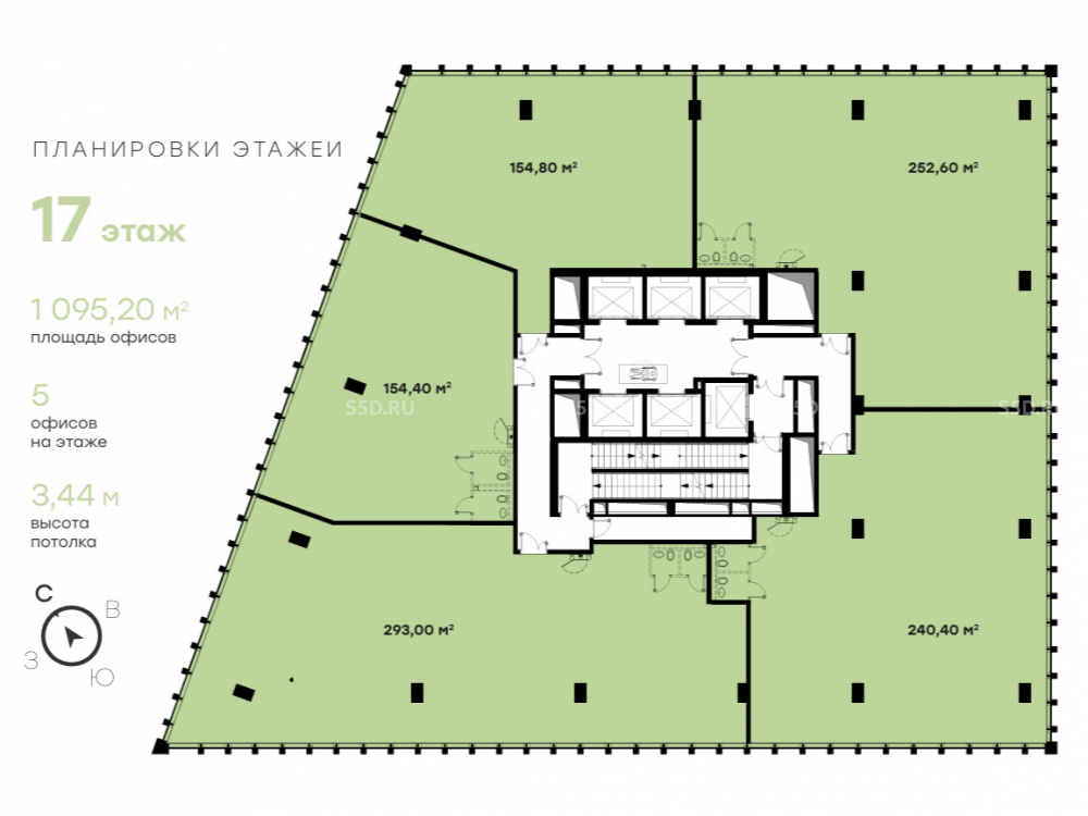 Общая площадь помещения – 1 095,2 м², 17 этаж. Отдельный вход. Витринное остекление. Высота потолков – 3,4 м. Электрическая мощность – 100 кВт. Коммуникации: ГВС, ХВС, ГК. Центральная приточно-вытяжная вентиляция. Кондиционирование. Круглосуточная охрана. Видеонаблюдение. Лифты: 5 пассажирских. 4 уровня подземного паркинга. Место для размещения рекламы.