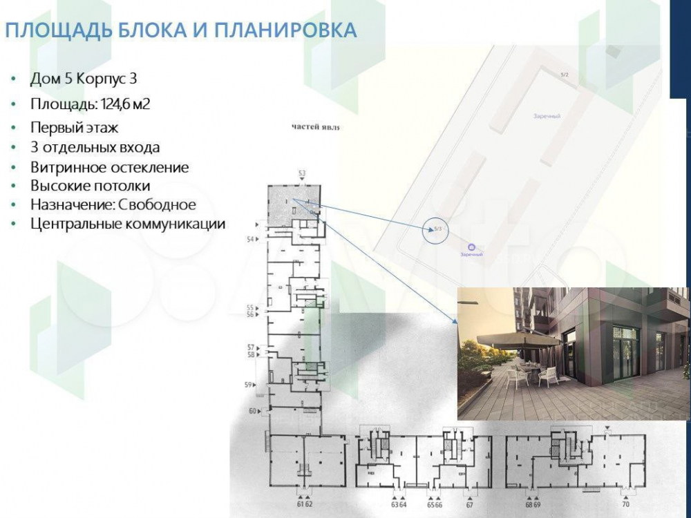 Общая площадь: 124,6 кв. м. (1 этаж). Угловое расположение с панорамным остеклением по фасаду и двумя входами. Чистовая отделка. Высота потолков: 3,9 м. Электрическая мощность: по запросу. Бесплатная парковка.