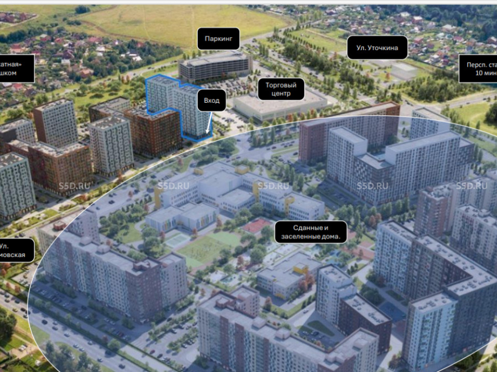 торгового центра, сложный перекресток - пересечение двух центральных улиц. Помещение находится на стыке двух очередей, в центре района помещения свободного назначения на первой линии, «смотрит» на променад и зону парковки. Дом сдан, ключи получены, собственность. Хорошо просматривается издалека с улицы Уточкина, со стороны заселенной очереди. Примыкает к торговой галерее стилобатной части здания. Все квартиры в проекте с отделкой. Всего в ЖК 17 корпусов. Перспективная часть Новой Москвы, где развернулось масштабное строительство дорог и метро. В проекте новая станция метро в 10 минутах пешком от ЖК.