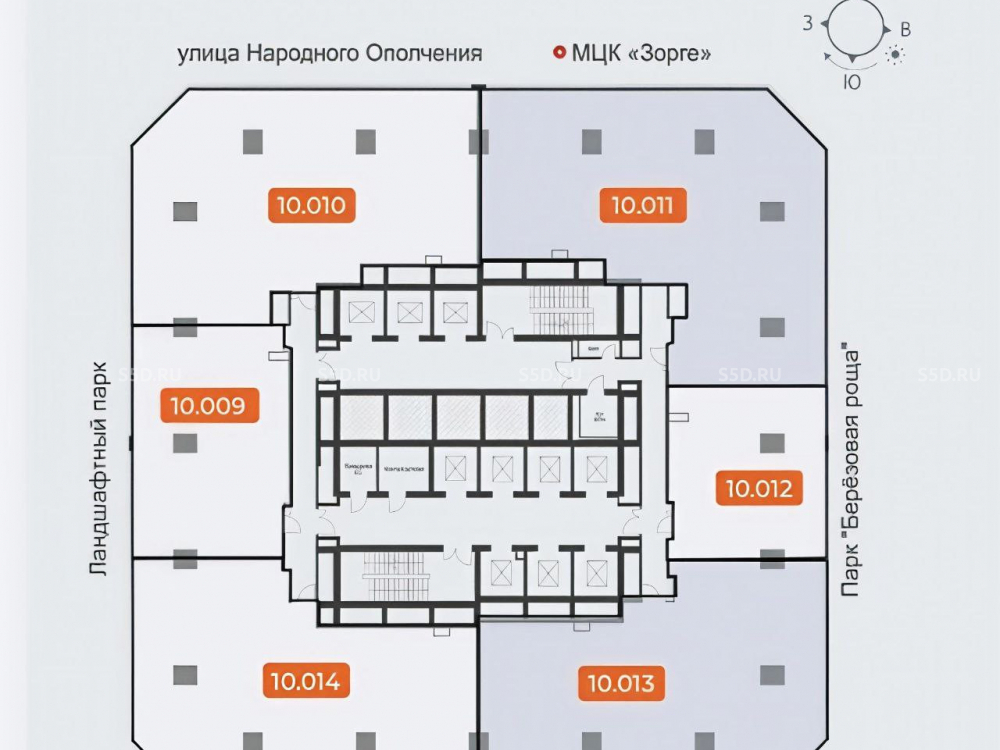 Офисное помещение на 10-м этаже (№ 10.011). Общая площадь: 279,17 кв. м. Отдельный вход и панорамное остекление. Высота потолков: 3,6 м. Отделка: Shell&Core.