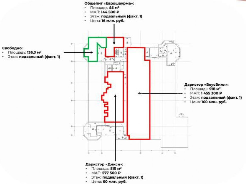 Общая площадь: 85 кв. м. (подвальный этаж). Высота потолков: 3 м. Центральные коммуникации. Электромощность — по запросу. Большой собственный паркинг, огороженная охраняемая территория, удобная зона погрузки/разгрузки.
