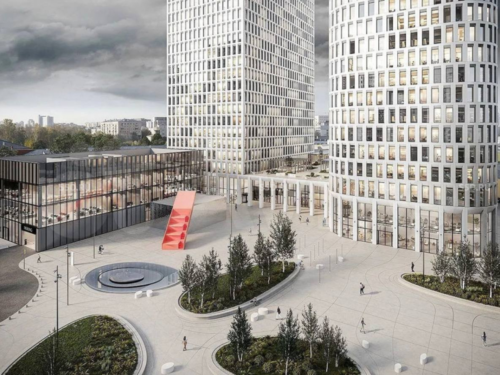 БЦ представляет собой две 24-этажные офисные башни, объединенные двухуровневым стилобатом.
